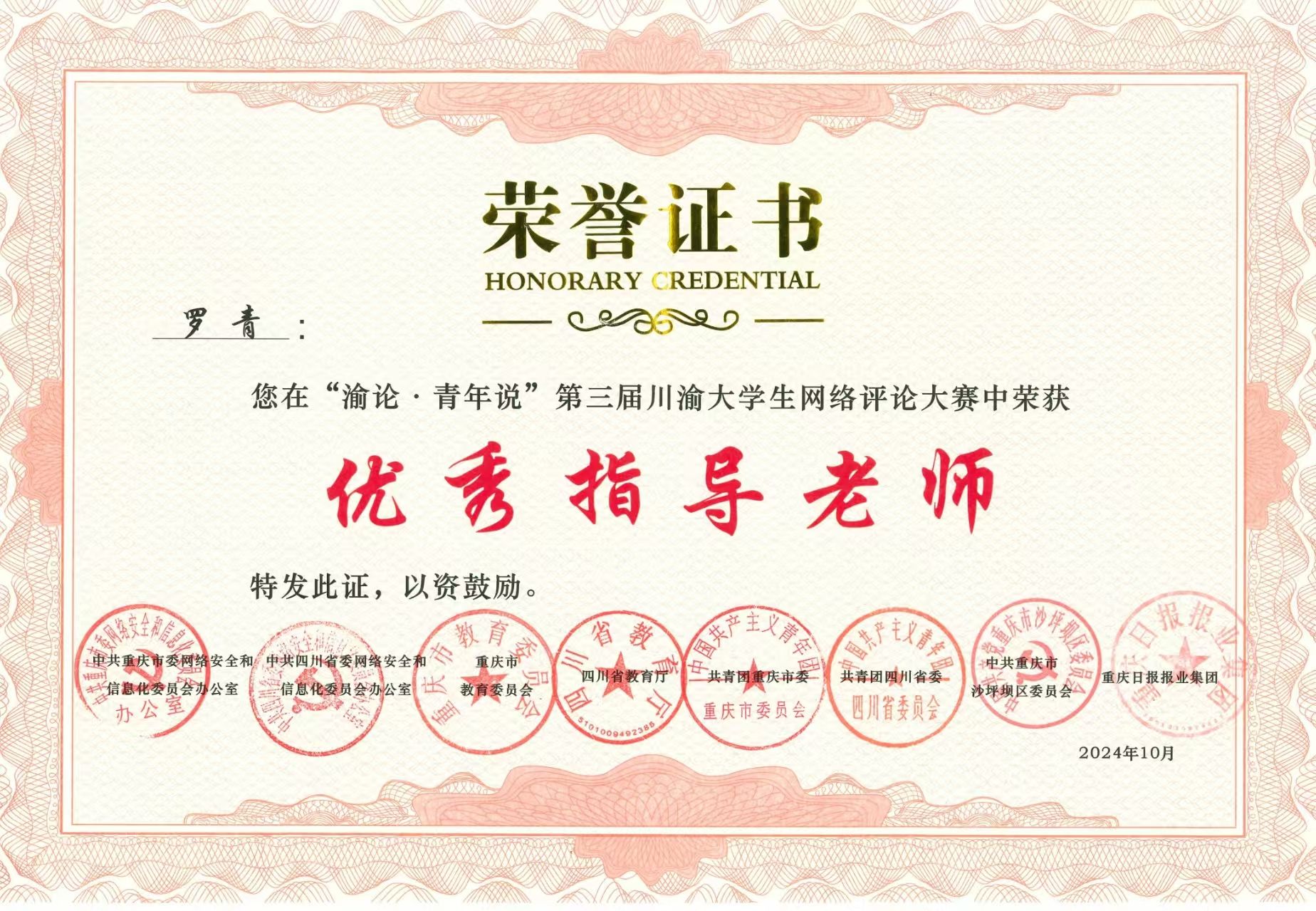 入职以来,罗青老师充分发挥自己的专业优势和实践经验,指导学生参与各类新闻大赛,取得了丰硕的成果。在他的指导下,新采学院学生们在第十二届铁塔记者节全国大学生新闻采写大赛,第三届全国大学生体育新闻写作大赛,以及第三届川渝大学生网络评论大赛等比赛中获得多个奖项。