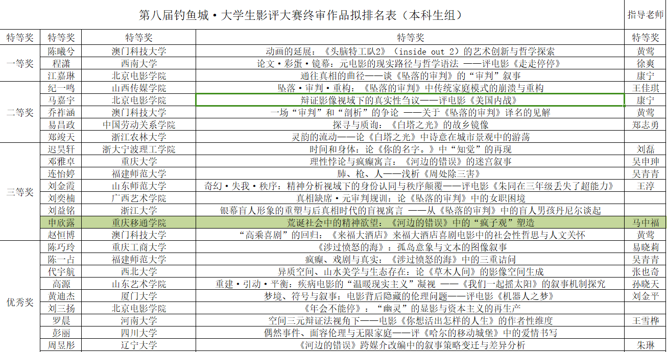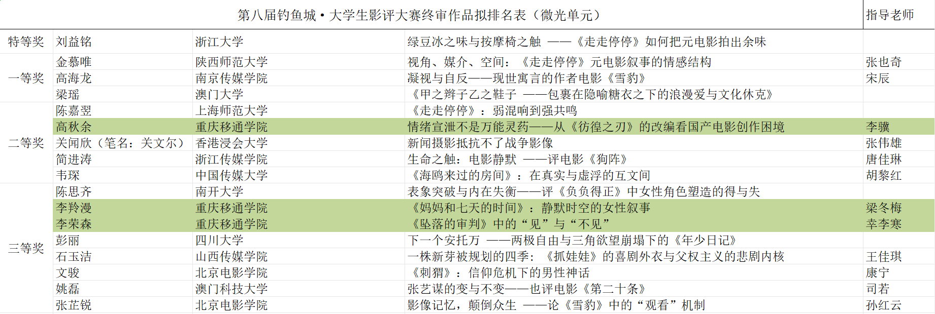 2024年10月,由重庆市电影家协会、重庆市文艺评论家协会、重庆移通学院主办的第八届钓鱼城·大学生影评大赛落下帷幕。重庆移通学院在主竞赛单元本科组两人入围,一人斩获三等奖。“微光”影评人单元有9人角逐入围,最终有5位学生分别荣获二等奖,三等奖,优秀奖的奖项。
