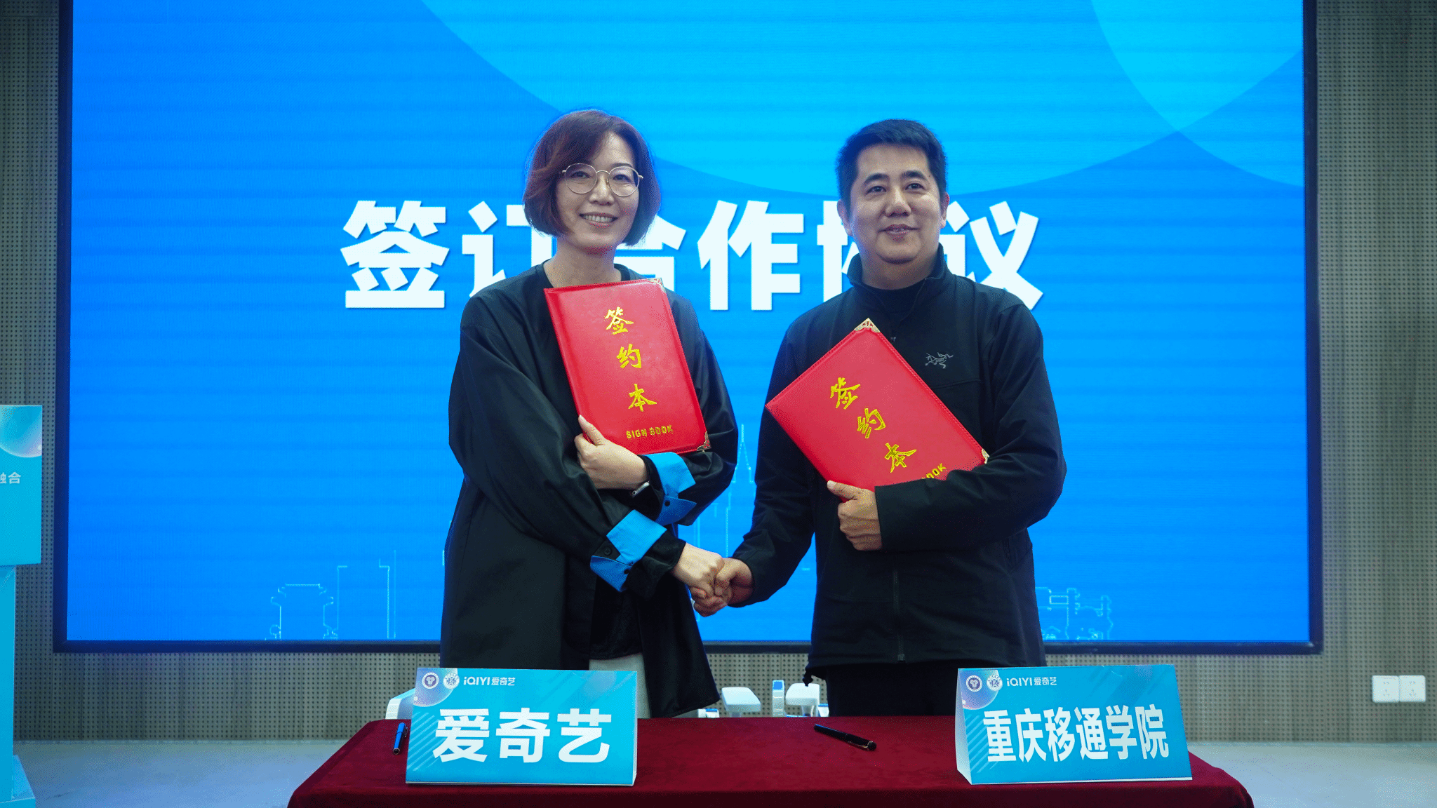 在合作协议签署环节,双方代表在与会人员的见证下,正式签署了合作协议。这一时刻标志着双方合作的正式启动,也预示着重庆移通学院与爱奇艺之间将展开更加深入、广泛的对话与合作,共同探索新媒体影视产教融合的新路径。