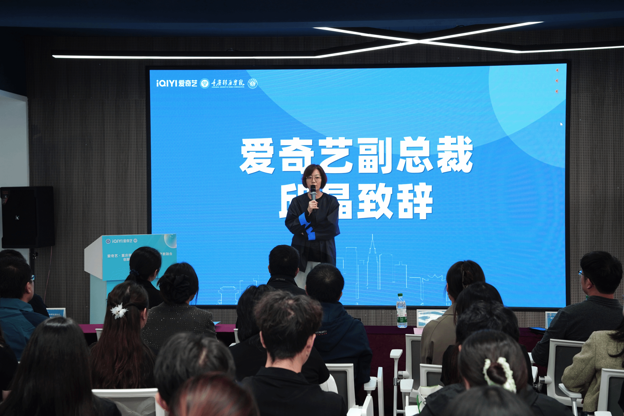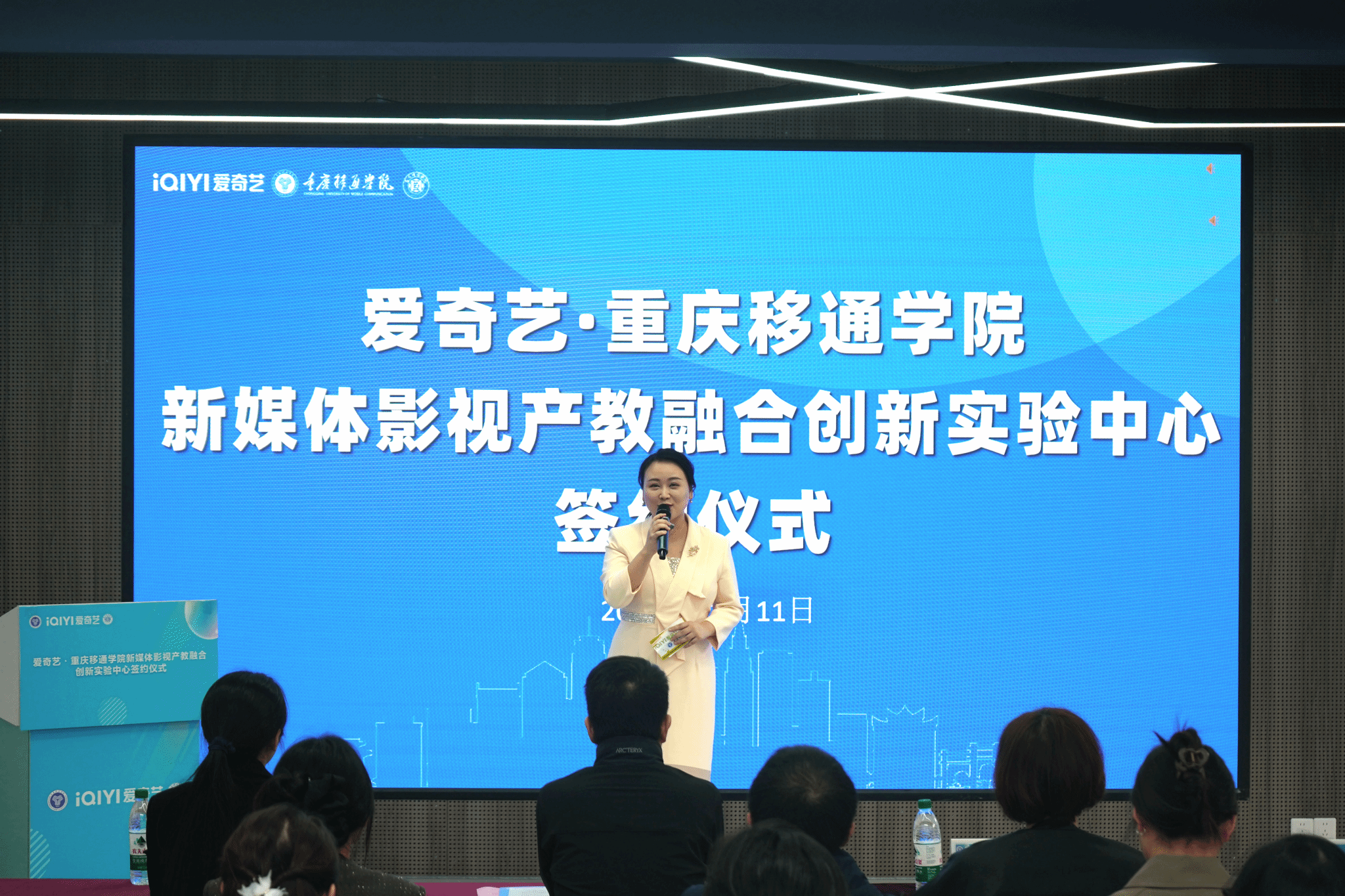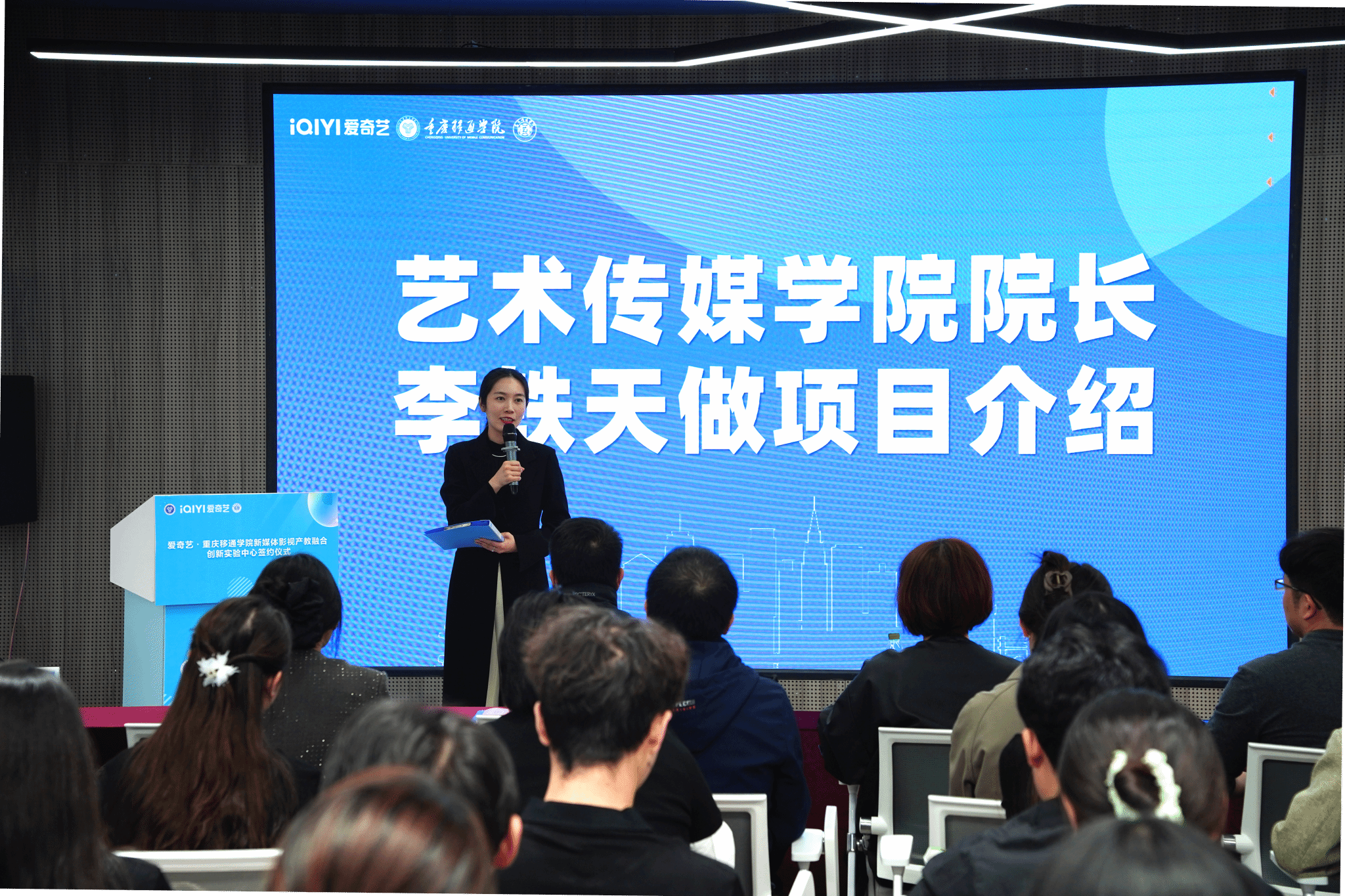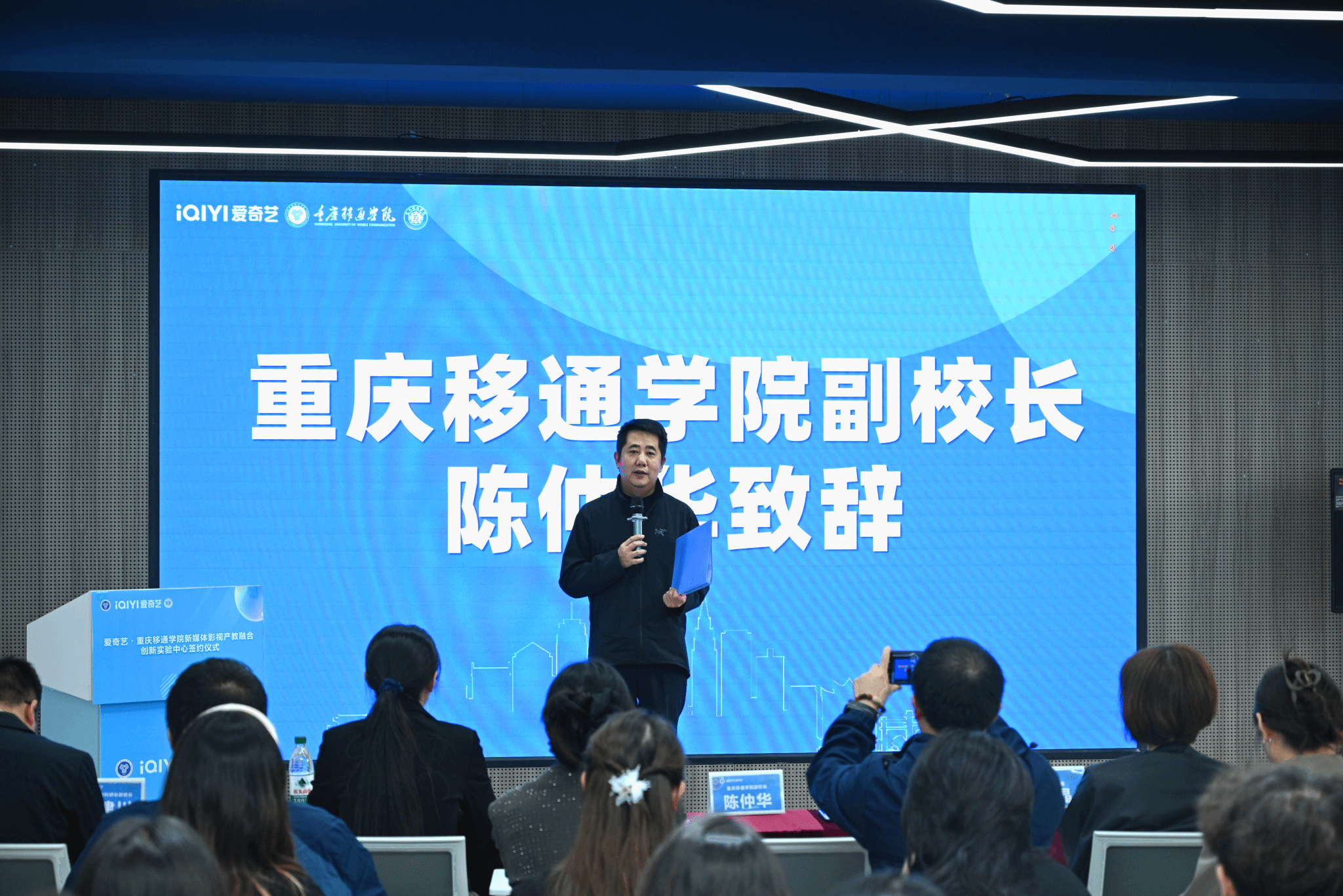 随着信息技术和新媒体的兴起,影视产业迎来新机遇与挑战,为切实加强校企合作,深度进行产教融合,重庆移通学院与爱奇艺于11月11日下午2点在松格书院智造完满展厅成功举行了“爱奇艺·重庆移通学院新媒体影视产教融合创新实验中心”(简称“创新中心”)签约仪式。爱奇艺副总裁邱晶、爱奇艺重庆公司副总经理赵轩、重庆移通学院副校长陈仲华、艺术传媒学院院长李轶天、双体软件精英产业学院院长张炼、发展规划与科研处副处长刘建川等出席本次会议,同时,参会人员还有艺术传媒学院教学副院长张梅、学工副院长郭菲、爱奇艺HRBP唐澜、爱奇艺培训经理谢云亚、爱奇艺高级培训师武佳琛、艺术传媒学院就创办主任胡磊、毕业班辅导员以及“桃创成长营”第一期36名学员。本次会议由艺术传媒学院黄慧老师主持。