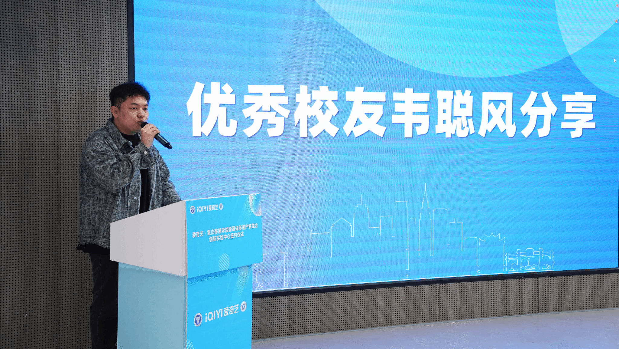 签约仪式后,就职于爱奇艺新媒体运营岗的2023届数字媒体艺术专业的优秀校友韦聪风就自身经历予大家做了分享,他强调,创新是行业发展的关键,尤其是在流行元素快速更新迭代的今天,保持创新能力对于把握客户需求和市场动态至关重要。此外,他还鼓励同学们要主动学习,敢于创新,紧跟时代潮流。此番话语引起了同学们强烈的共鸣。