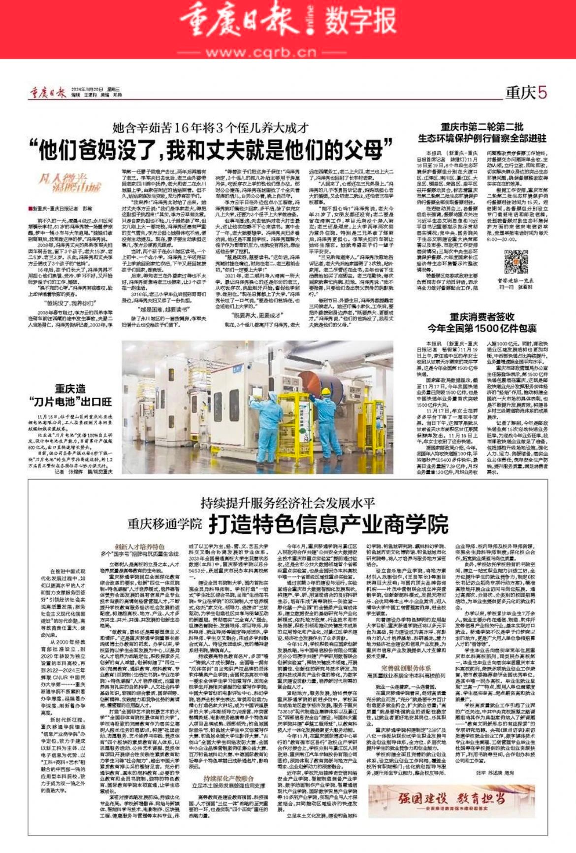 近日,重庆日报以《持续提升服务经济社会发展水平 重庆移通学院打造特色信息产业商学院》为题,半版篇幅报道重庆移通学院通过创新人才培养模式、深化产教融合和完善就创服务体系,为区域经济社会发展提供人才和技术支撑,实现高质量就业。
