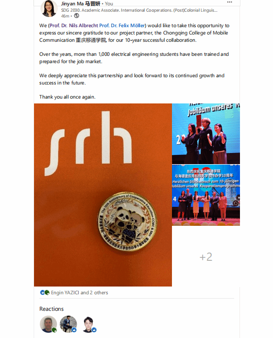 在圆满结束此次行程之后,Prof. Dr. Nils Albrecht 与马晋妍女士于国际知名职业社交平台LinkedIn(领英)上公开发布文章,对此次重庆之行的整体经历给予了高度评价与积极反馈。马晋妍女士在文章中特别指出:“We would like to take this opportunity to express our sincere gratitude to our project partner, the Chongqing College of Mobile Communication(重庆移通学院), for our 10 - year successful collaboration.(我们借此机会向我们的项目合作伙伴重庆移通学院表达诚挚的感谢,感谢双方十年来的成功合作。)”她着重强调,历经多年的精心培育与发展,该合作办学项目已成功培养并向社会输送了超过1,000名电气工程专业领域的优秀学生。这些学生凭借在项目中所积累的扎实专业知识、丰富实践经验以及国际化视野,在步入就业市场后迅速适应并崭露头角,在各自的职业领域中取得了不俗的成绩与表现,不仅为个人职业发展奠定了坚实基础,亦为合作办学项目的良好口碑传播与品牌形象塑造起到了极为积极且关键的推动作用。她还进一步表示,SRH德国海德堡应用科技大学始终深切珍视与重庆移通学院所建立的长期合作伙伴关系,并对未来双方在教育教学、科研创新、人才培养等多方面合作的持续深化发展与取得更为卓越的成功成果满怀期待与坚定信心。