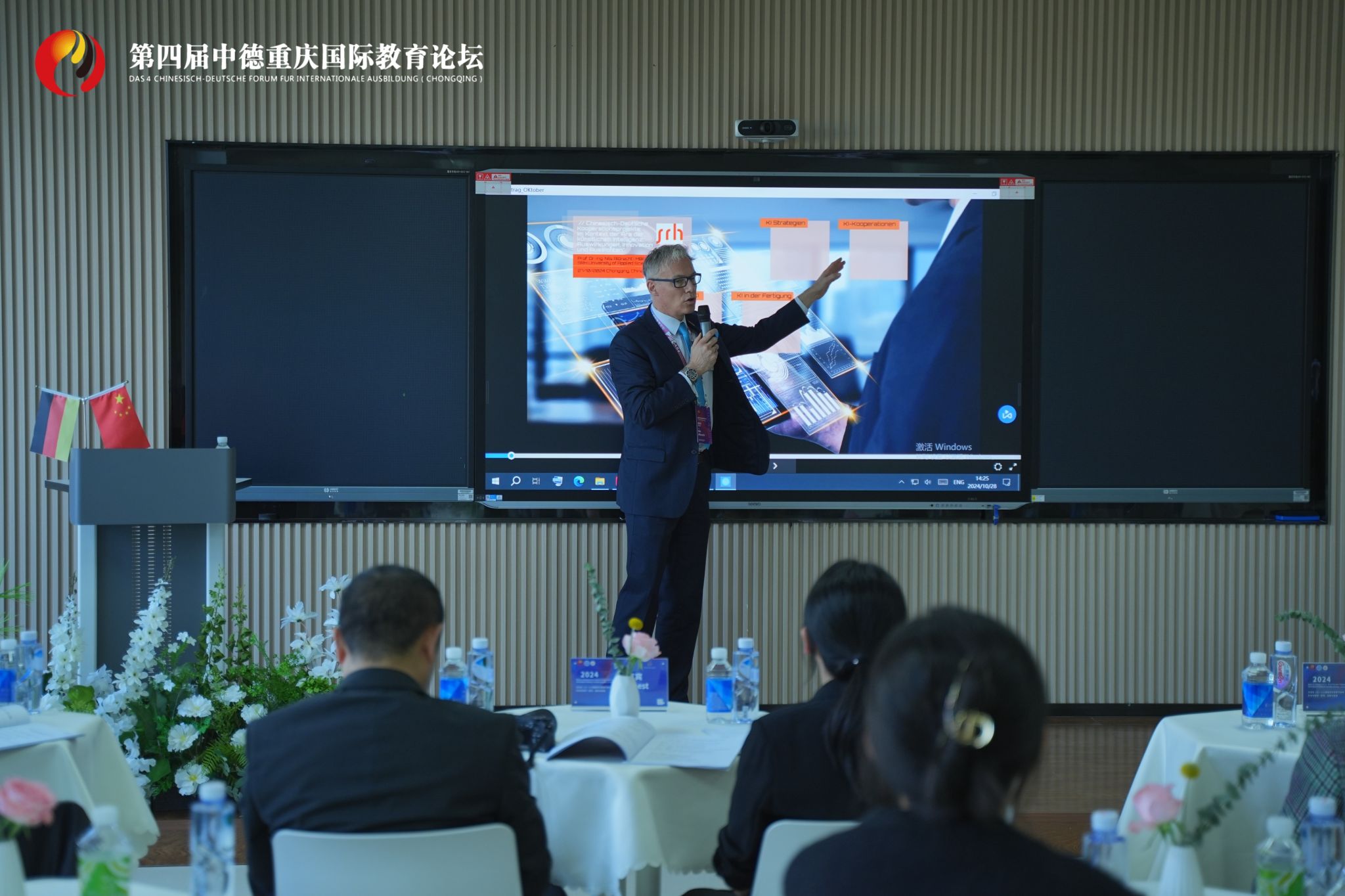 10月27日在中德重庆国际教育论坛上,Albrecht教授发表了一场主题为:Chinesisch - Deutsche Kooperationsprojekte im Kontext der Ära der künstlichen Intelligenz: „Auswirkungen, Innovation und Aussichten“(人工智能时代背景下的中德合作项目:影响、创新与展望)的极具深度与前瞻性的精彩演讲。Albrecht教授深入且系统地剖析了在人工智能技术迅猛发展的当下时代背景之中,中德合作办学项目所面临的一系列复杂机遇与严峻挑战,并就如何通过创新合作模式、优化教育资源配置以及强化教学实践环节等多维度策略推动项目的进一步可持续发展提出了诸多独到且具有建设性的见解与思路,充分彰显了中德教育交流与合作过程中的多元融合与协同创新精神。