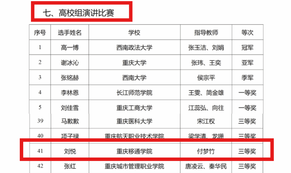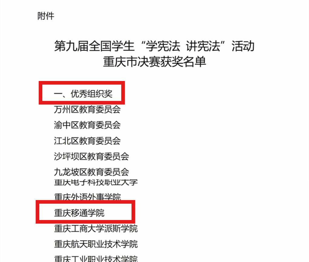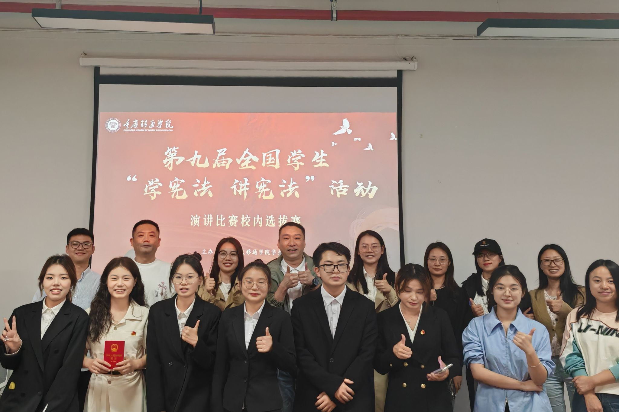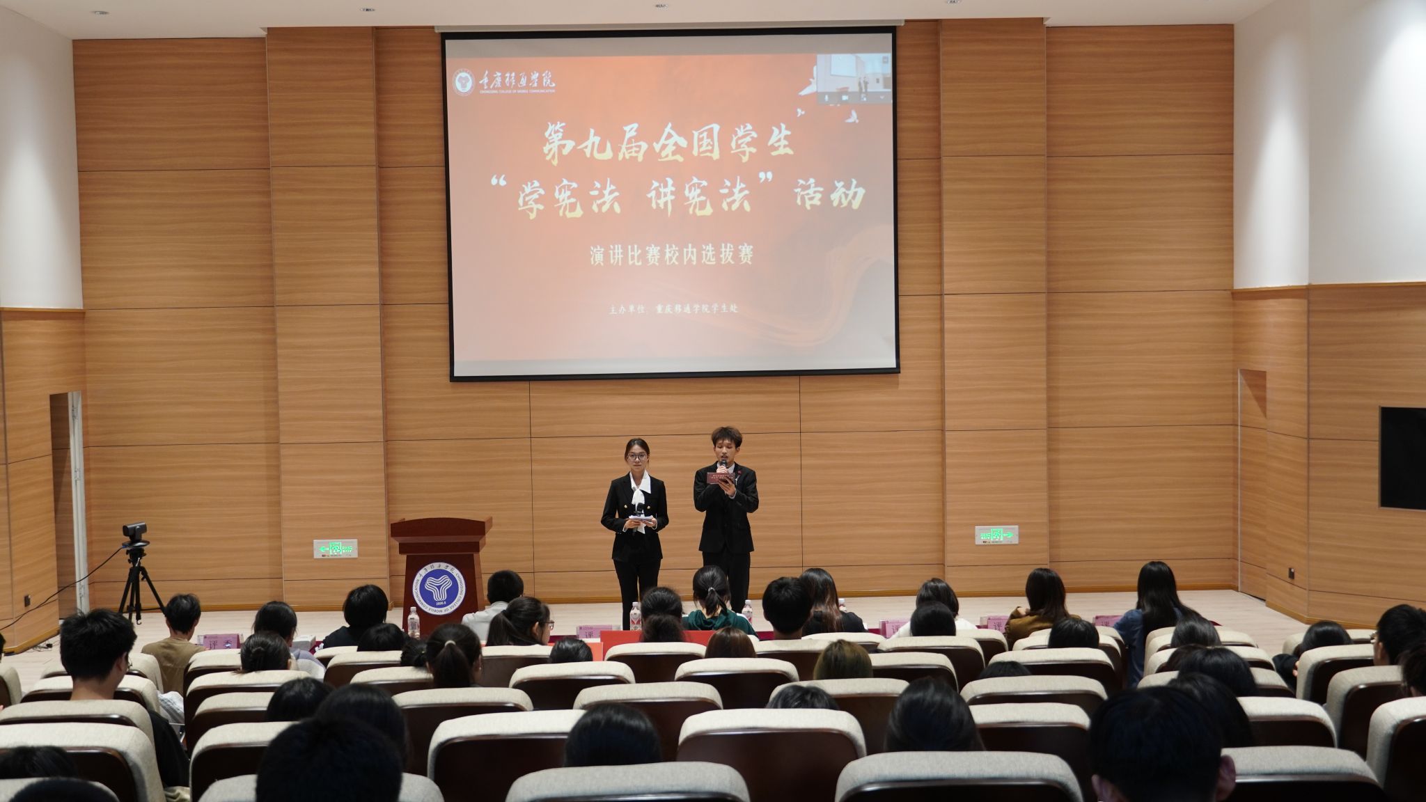 2024年11月9日至10日,第九届全国学生“学宪法 讲宪法”活动重庆市决赛在谢家湾学校举行,我校荣获“优秀组织奖”“团体三等奖”集体荣誉,刘悦同学荣获“高校组演讲比赛三等奖”、吴张珂同学荣获“高校组(非专业类)知识竞赛三等奖”。