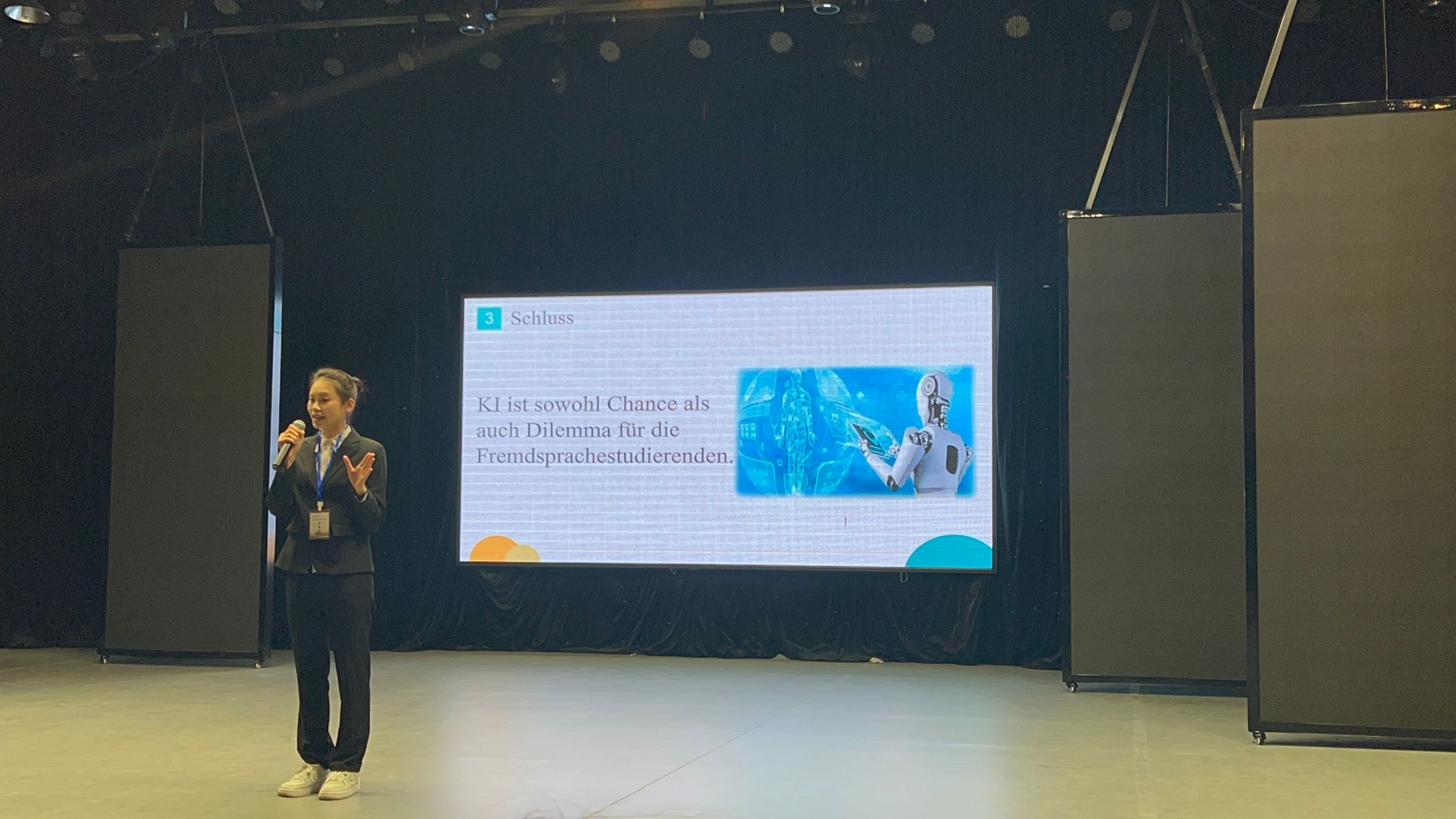 在命题演讲环节,梁东玲同学以《人工智能对外语学习者既是机遇也是困境》为题,用流利的德语展开了深入的探讨。她从人工智能技术在语言学习中的应用出发,分析了AI带来的便利与挑战,并提出了如何在外语学习中有效利用AI技术的建议。其演讲内容深刻、逻辑严密,展现了外国语学院学子对现代科技与外语教育结合的深刻理解。