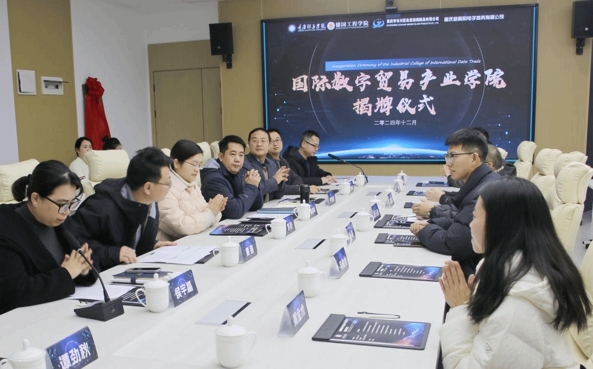 12月12日10时,重庆移通学院与重庆市合川区金星玻璃制品有限公司、重庆梦翼购电子商务有限公司共建的国际数字贸易产业学院在合川校区云端会议室揭牌成立。产业学院的组建旨在为数字贸易领域培育具有国际竞争力的创新型人才,推动地方经济数字化转型,这标志着我校在产教融合、国际合作的道路上迈出重要一步。