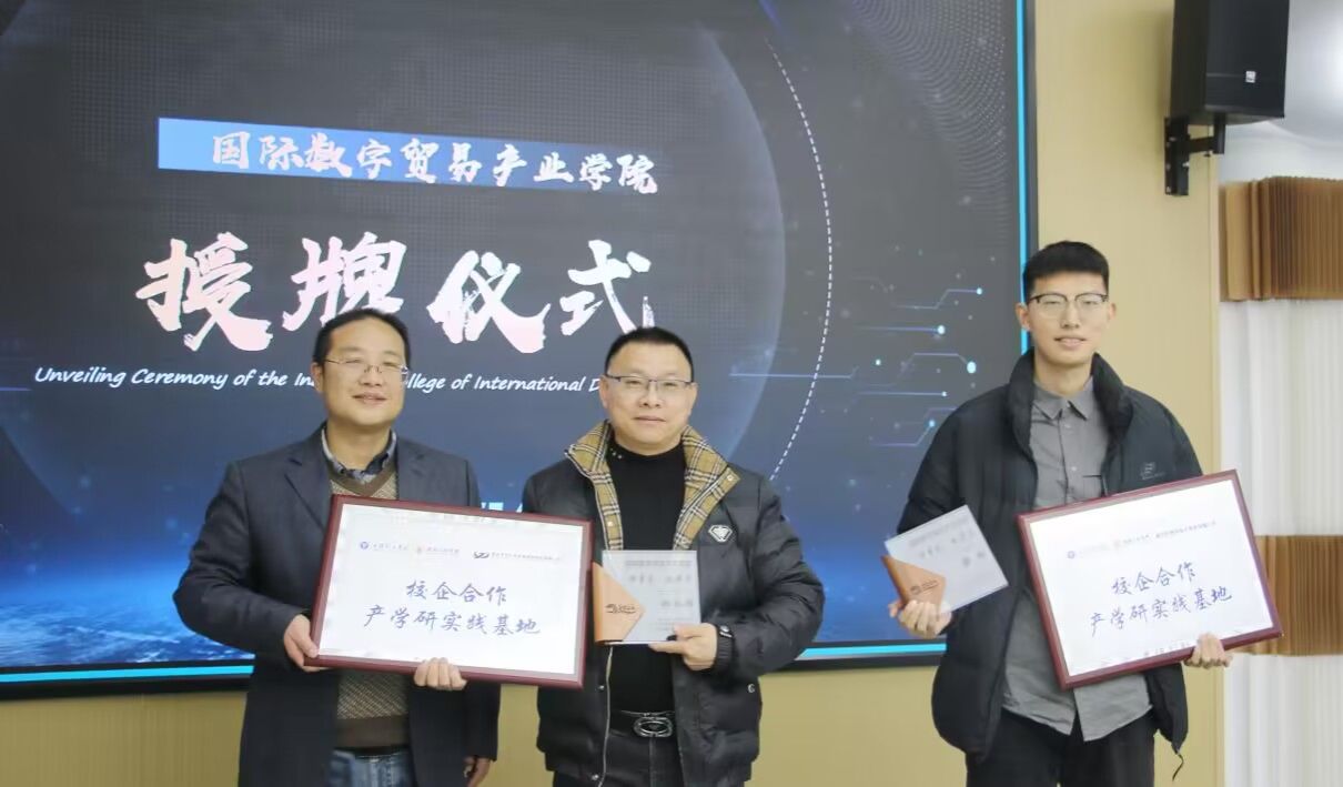 副校长陈仲华、合川区金星玻璃制品有限公司副总经理姚元彬、重庆梦翼购电子商务有限公司董事长杨桓共同为国际数字贸易产业学院揭牌,标志着学院正式成立。