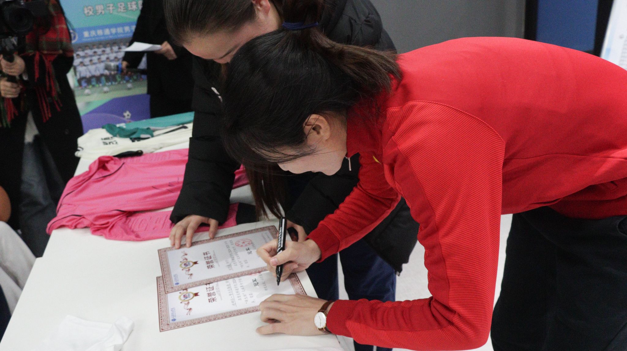互动结束后,王焱老师亲切的为同学们的球衣签上带有祝福和好运加成的签名,代表这对移通校队的期待与祝福,并赠送给我校一件签名纪念版个人球衣,让我们带着这份祝福与期待,持续开展学校体育各项活动赛事,构建起全校体育育人大格局。