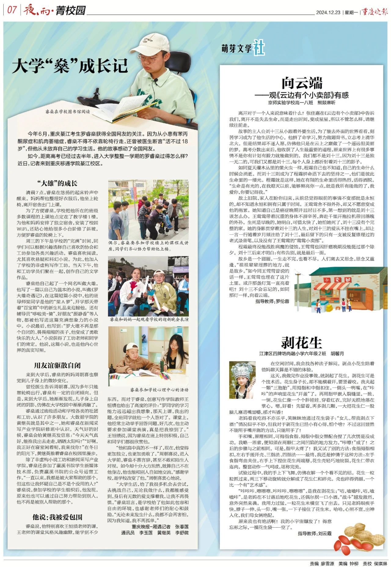 “感谢学校给了我如此包容和自由的环境,也感谢老师们的耐心和鼓励。同时,我还想感谢自己,走出了曾经了迷茫,选择了坚定的未来。”睿燊说,现在的他不再“被动”,他会主动去创造自己想要的未来。“无论未来发生什么,我都不会再害怕,因为我知道,我不再孤单。”