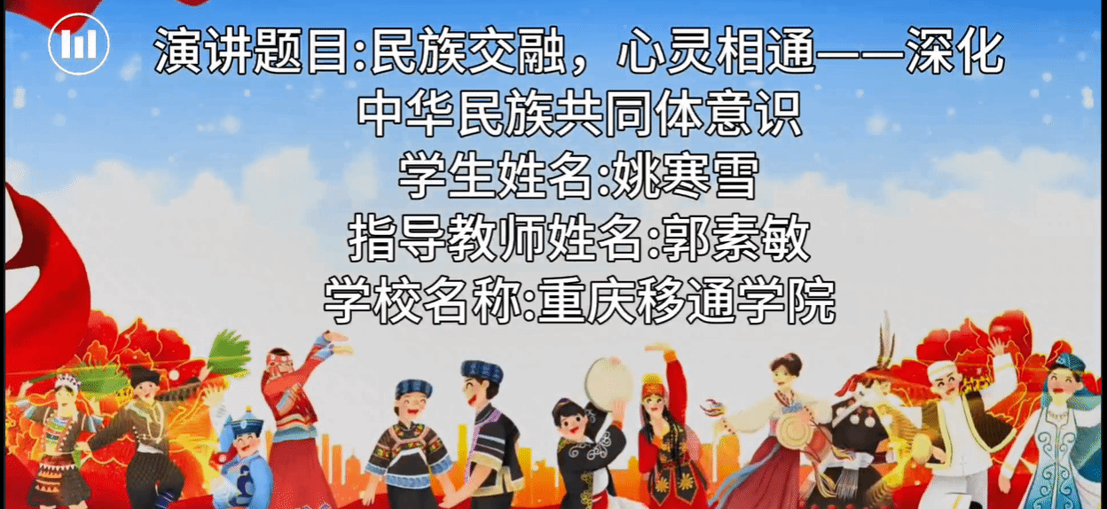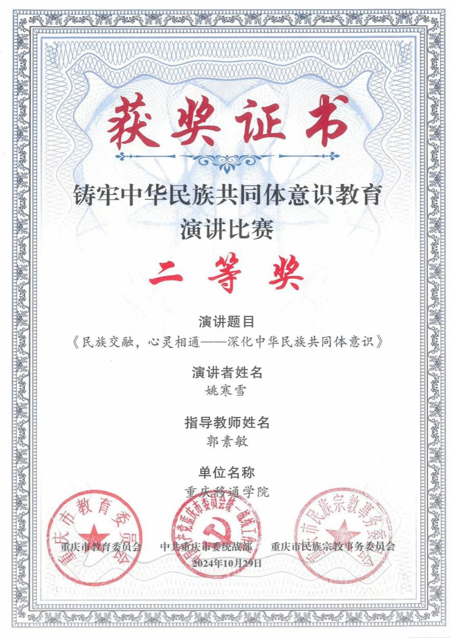 根据《重庆市教育委员会中共重庆市委统战部重庆市民族宗教事务委员会关于举办铸牢中华民族共同体意识教育演讲比赛的通知》(渝教基函〔2024〕72号)文件精神,学校党委统战部组织发动学校各级党组织踊跃参赛、积极投稿,收到视频稿件共计32余篇。经前期筛选推荐,市教委、市委统战部、市民族宗教委专家组评审和公示,我校淬炼商学院学生姚寒雪、指导教师郭素敏的演讲稿件《民族交融,心灵相通--深化中华民族共同体意识》荣获铸牢中华民族共同体意识教育演讲比赛活动市二等奖。