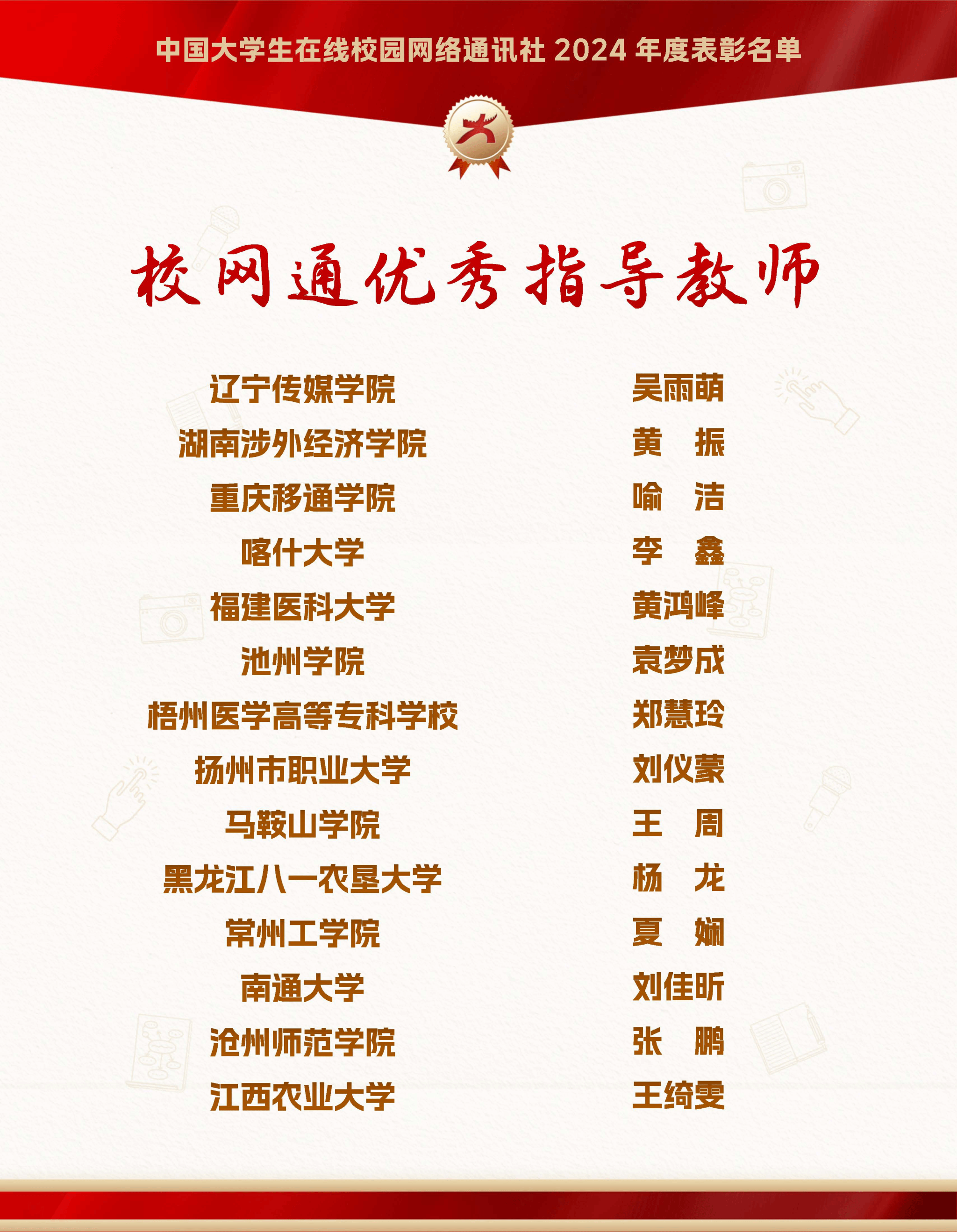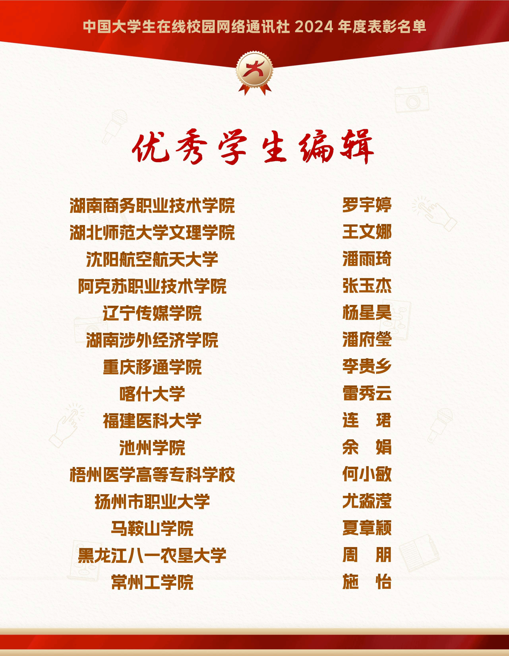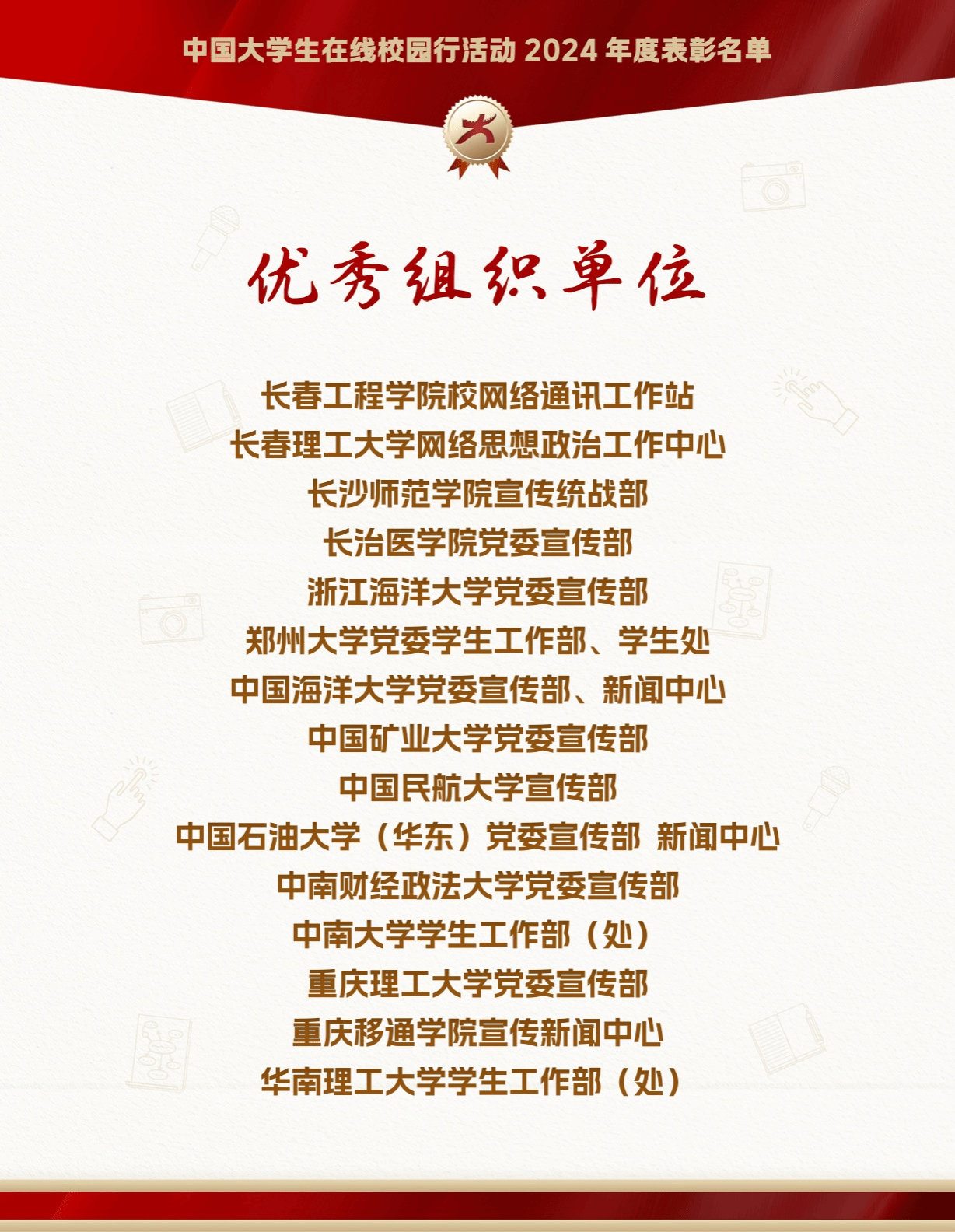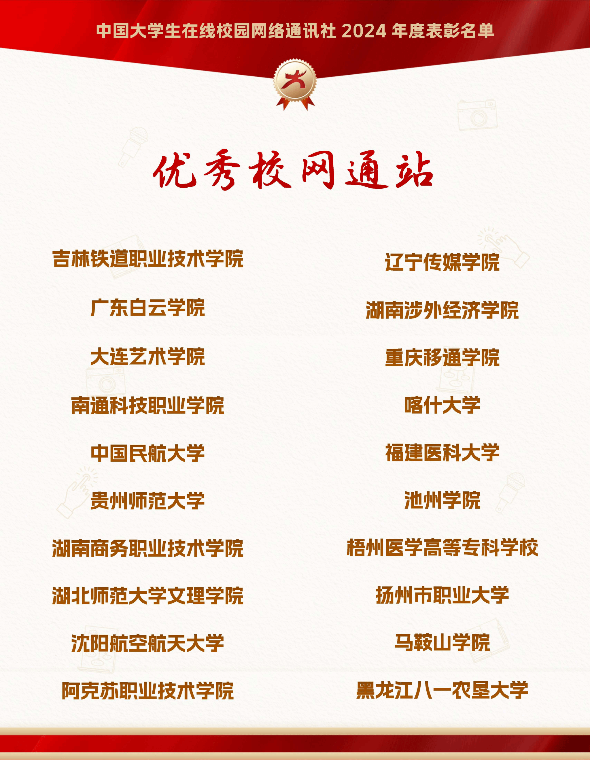 12月27日,教育部中国大学生在线公布2024年度校网通站及校园行活动表彰名单。我校网通站荣获优秀校网通站,学校宣传新闻中心入选2024年校园行优秀组织单位,宣传新闻中心喻洁老师荣获2024年度校网通优秀指导教师,艺术传媒学院李贵乡同学被评为2024年度优秀学生编辑。