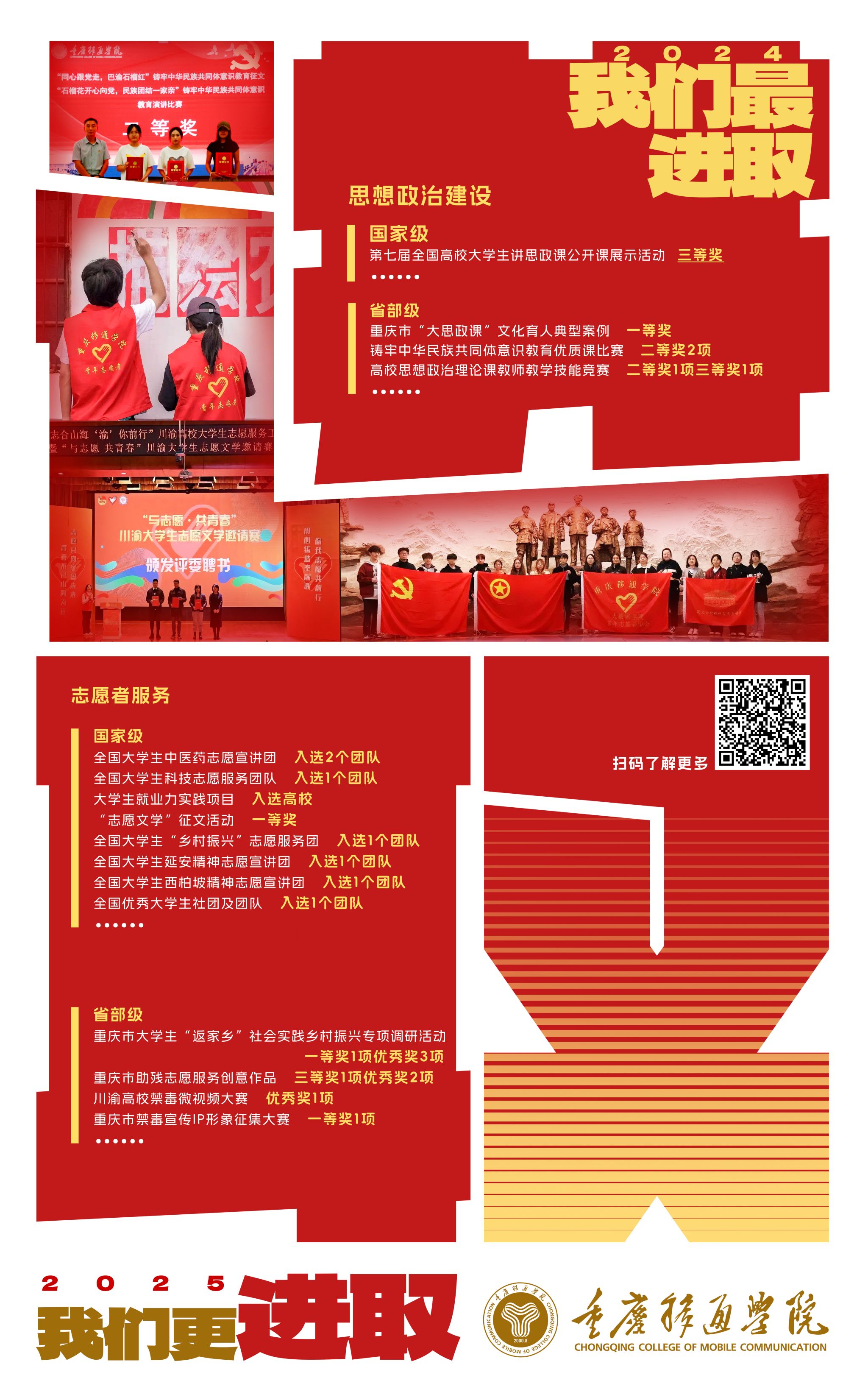2024年,秉持“我们最进取”的信念,学校将思想政治与志愿服务视为重中之重,全面动员、多维度发力,积极组织并深度参与各类思想政治竞赛与志愿活动,成果斐然。于思想政治领域,成功斩获1个国家级奖项以及17个省区级奖项;在志愿服务方面,更是在27个国家级赛事、6 个省级赛事中载誉而归。