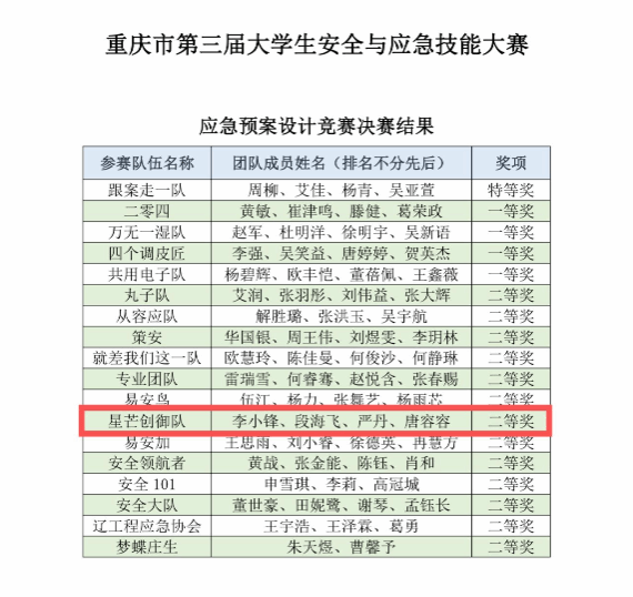 应急预案设计竞赛围绕突发自然灾害、事故进行预案设计,通过设计加深学生对应急管理理论的理解,增强社会责任感和使命感,锻炼团队协作能力,提高解决实际问题的能力。优秀的应急预案设计还可能被相关部门采纳,为社会的安全与发展做出贡献。本次比赛提交作品77项,经初赛评选,18项作品入围决赛,在现场答辩展示。重庆移通学院的星芒创御队在应急预案设计竞赛中,荣获“团体二等奖”。