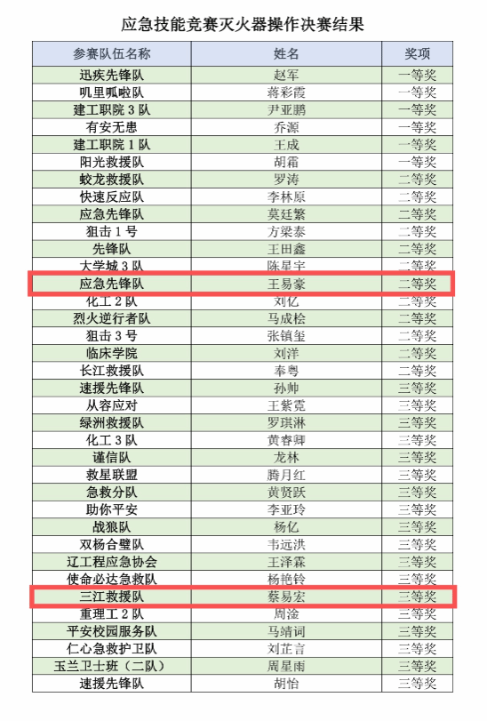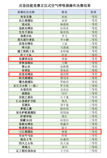 在应急技能竞赛的各个单项中,正压式空气呼吸器操作项目中,唐毅、谢浩然荣获“二等奖”,唐豪获得“三等奖”;
