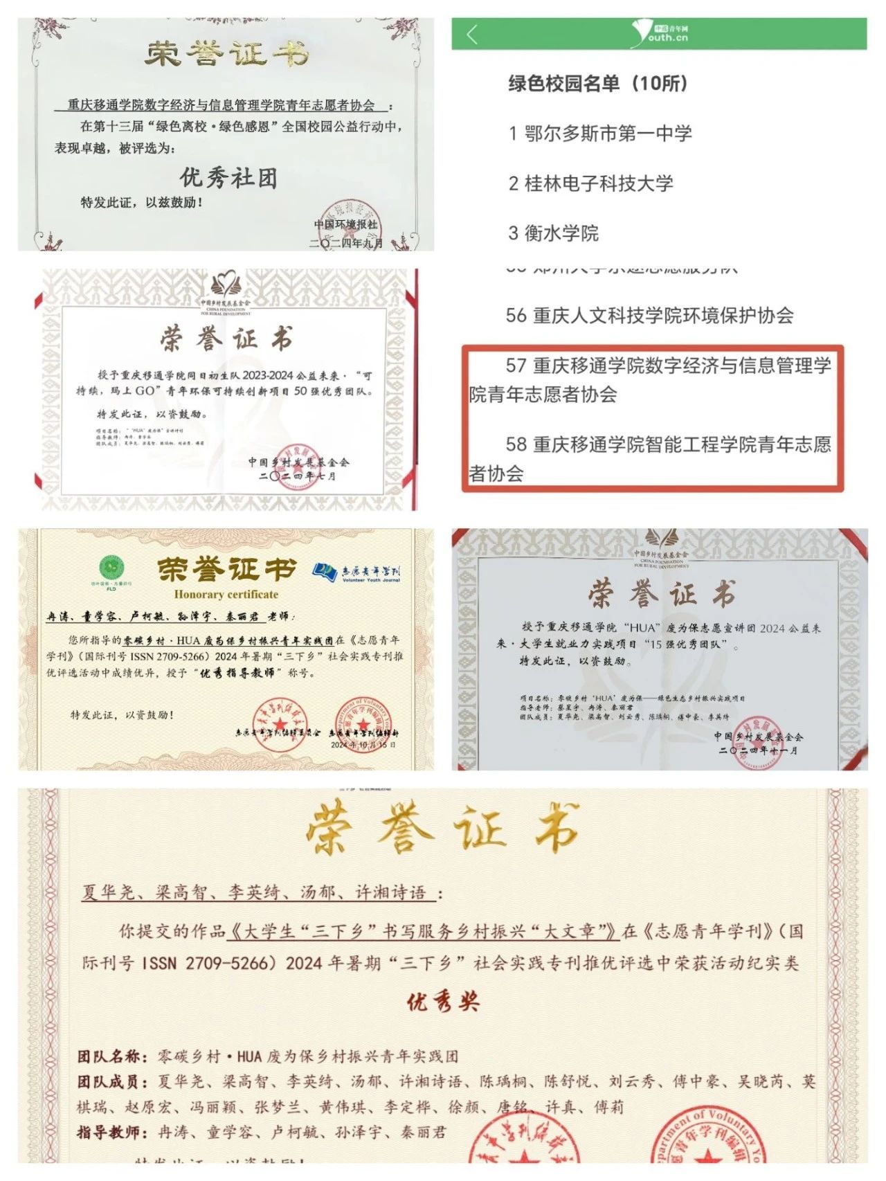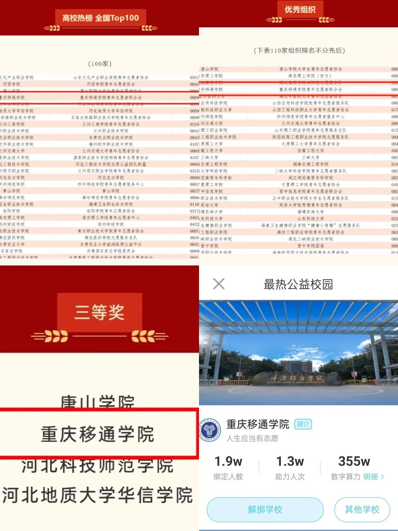 十余年间,学校斩获中国青年志愿者优秀组织奖、全国优秀西部计划项目办、全国最热公益校园、全国青年志愿服务项目大赛银奖、全国暑期社会实践优秀单位等国家级集体、个人荣誉奖项602项,第九届重庆青年志愿者优秀集体、智博会、西洽会等志愿服务先进集体等省部级集体、个人荣誉奖项651项,获《人民日报》等主流媒体报道超百次,多渠道发强音!