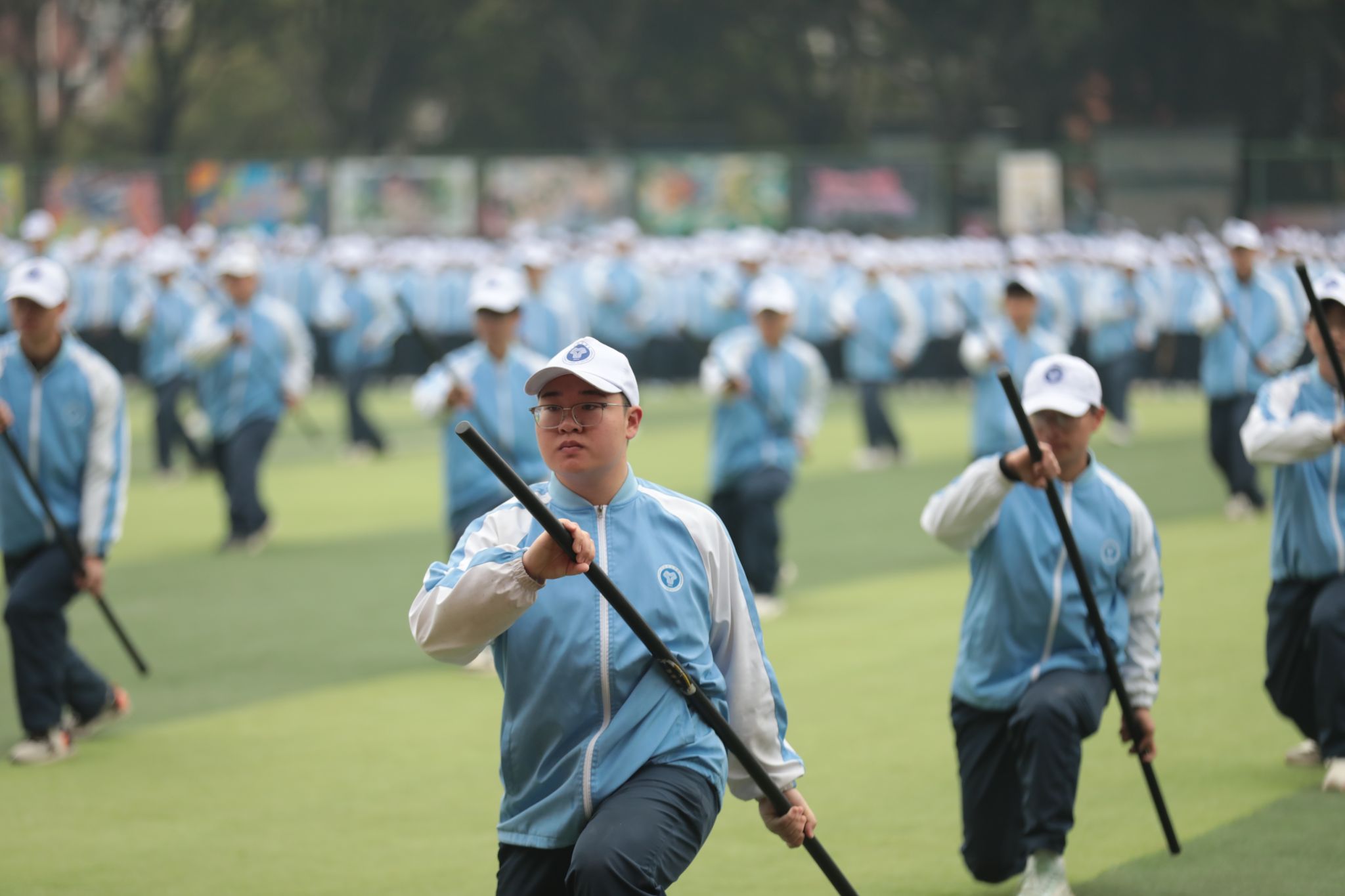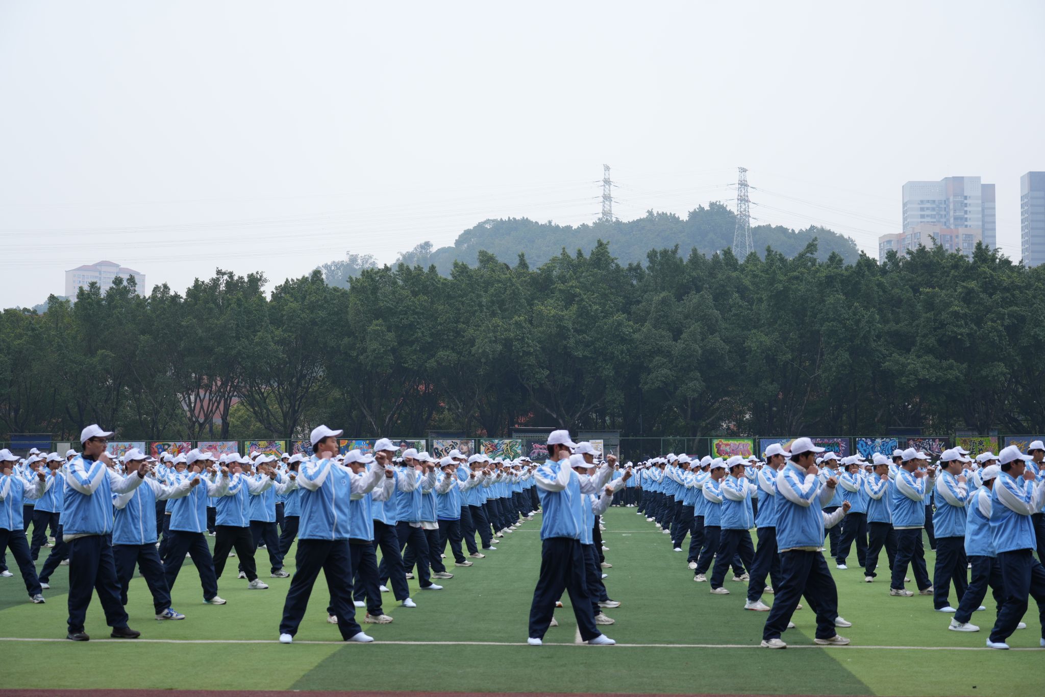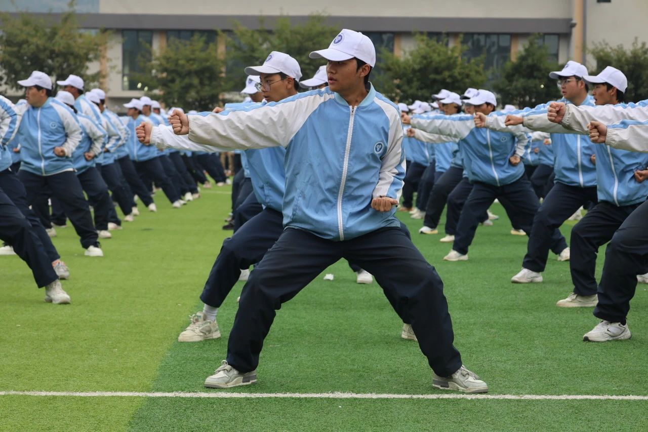 红旗飘扬,国歌嘹亮,新生们身着同色系服装,昂首挺胸,目光坚定,以标准军姿向国旗敬礼,共同奏唱国歌。升旗仪式结束后,在军训总教官的指挥下,双校区军训会操正式开始。
