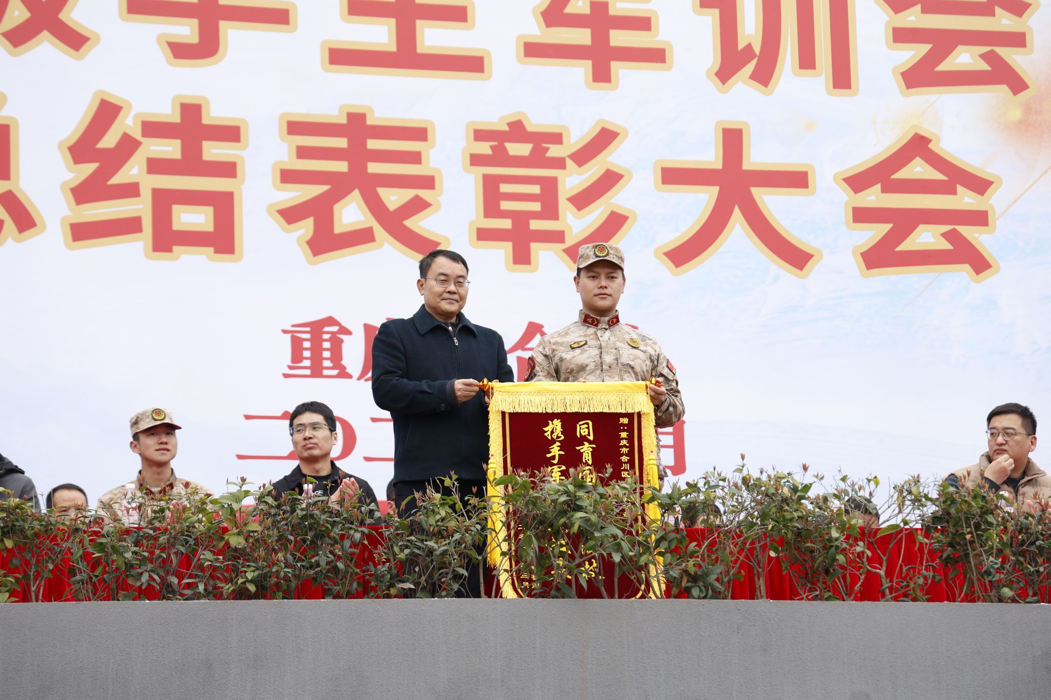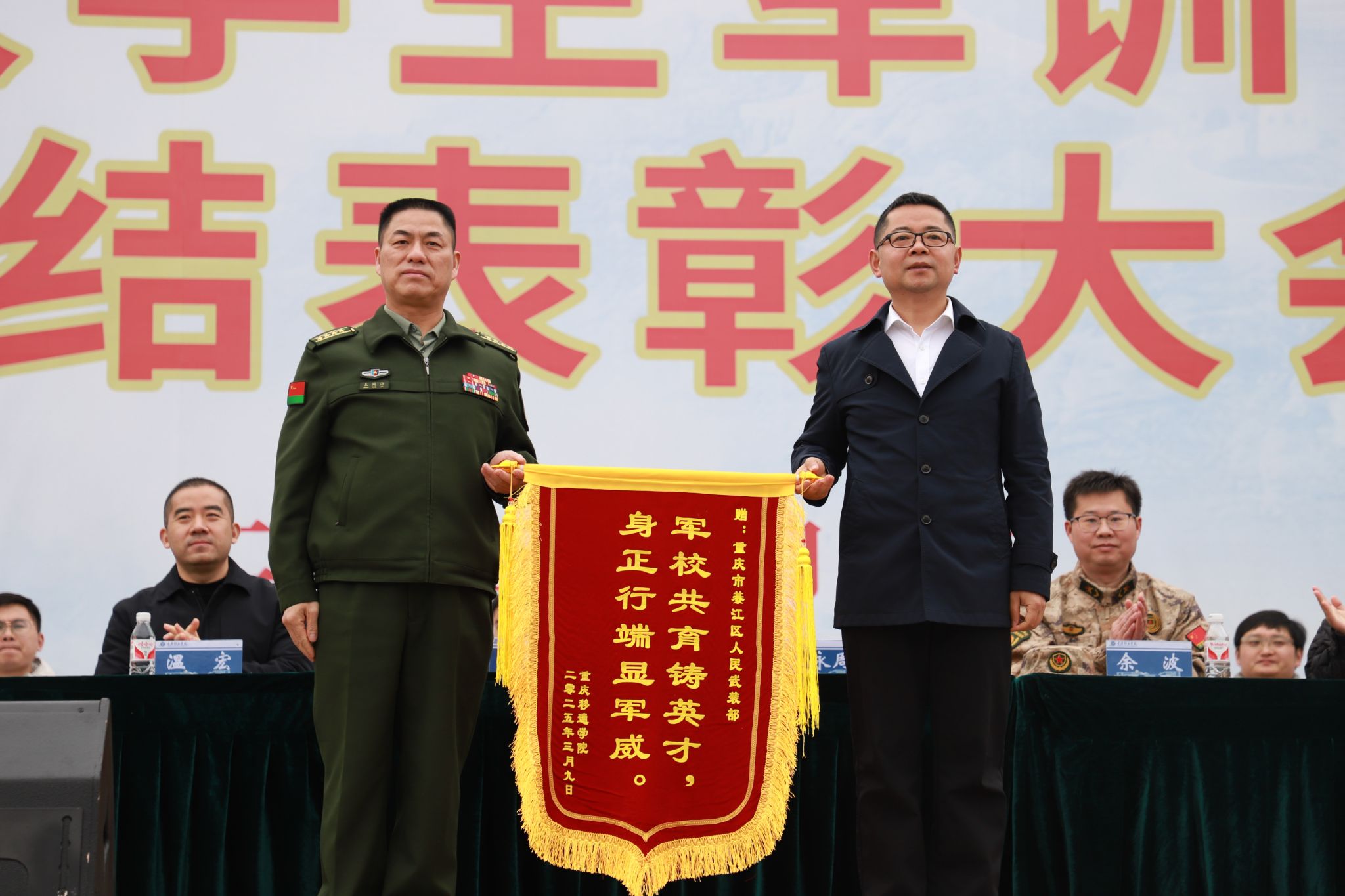 我校校长助理尹浩亮与谢银平宣读《重庆移通学院关于表彰2024级学生军训工作先进集体和优秀个人的通报》。校领导依次向此次军训工作中表现突出的优秀连队、教导员、指导员、学员进行表彰,并颁发锦旗和荣誉证书。我校党委书记、政府督导员何先刚与常务副校长王永周代表学校向合川区与綦江区人民武装部赠送锦旗,为军事训练画上阶段性句号。