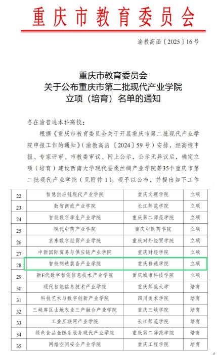 近日,重庆移通学院在应用型人才培养的征程中迈出了具有里程碑意义的关键一步 —— 学校申报的“智能制造装备产业学院”成功获批立项重庆市第二批现代产业学院建设项目,这是继重庆市新型二级学院建设项目后的又一重大突破!这不仅是重庆移通学院首次斩获此类产业学院建设项目,更是学校发展历程中的重要成果,标志着我校在产教融合、人才培养模式创新方面迈上了新的高度,为学校专业建设与人才培养注入了强大动力。