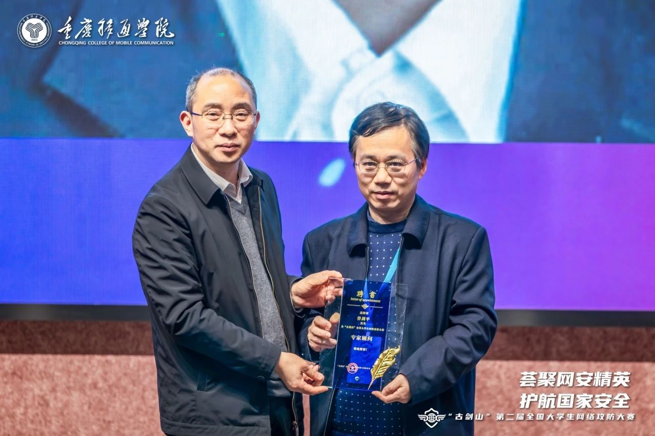 (重庆移通学院校长吕翊为范明钰教授颁发“古剑山”全国大学生网络攻防大赛专家顾问聘书)