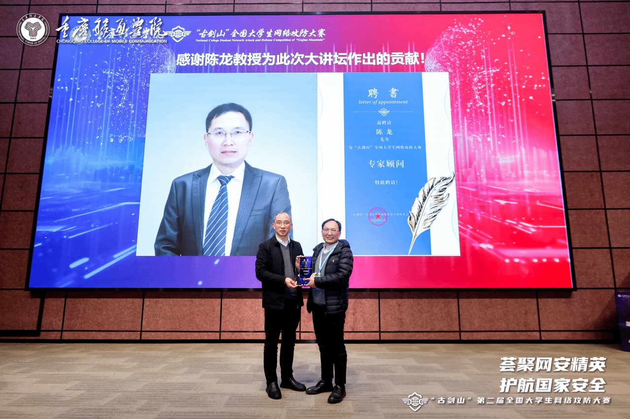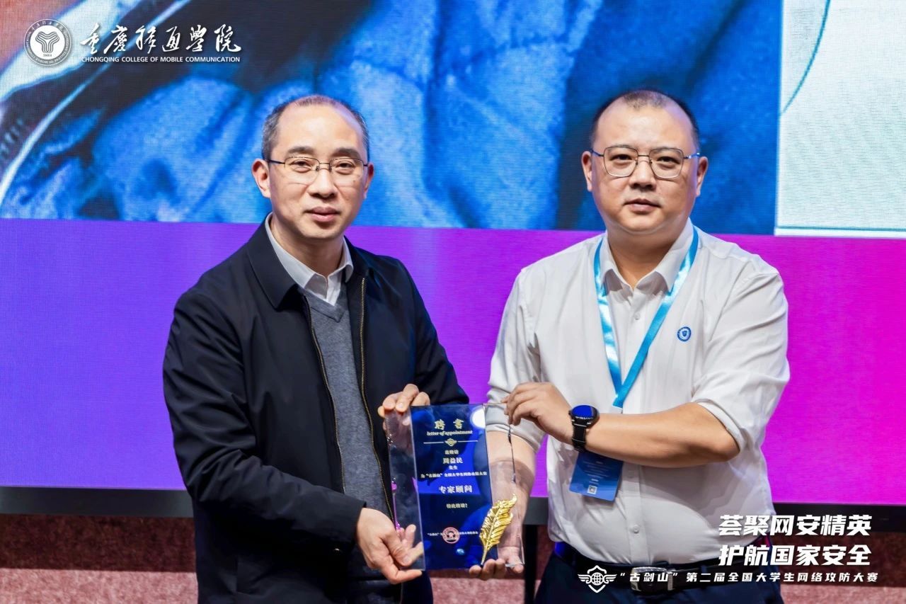 (重庆移通学院校长吕翊为黄广斌教授颁发“古剑山”全国大学生网络攻防大赛专家顾问聘书)