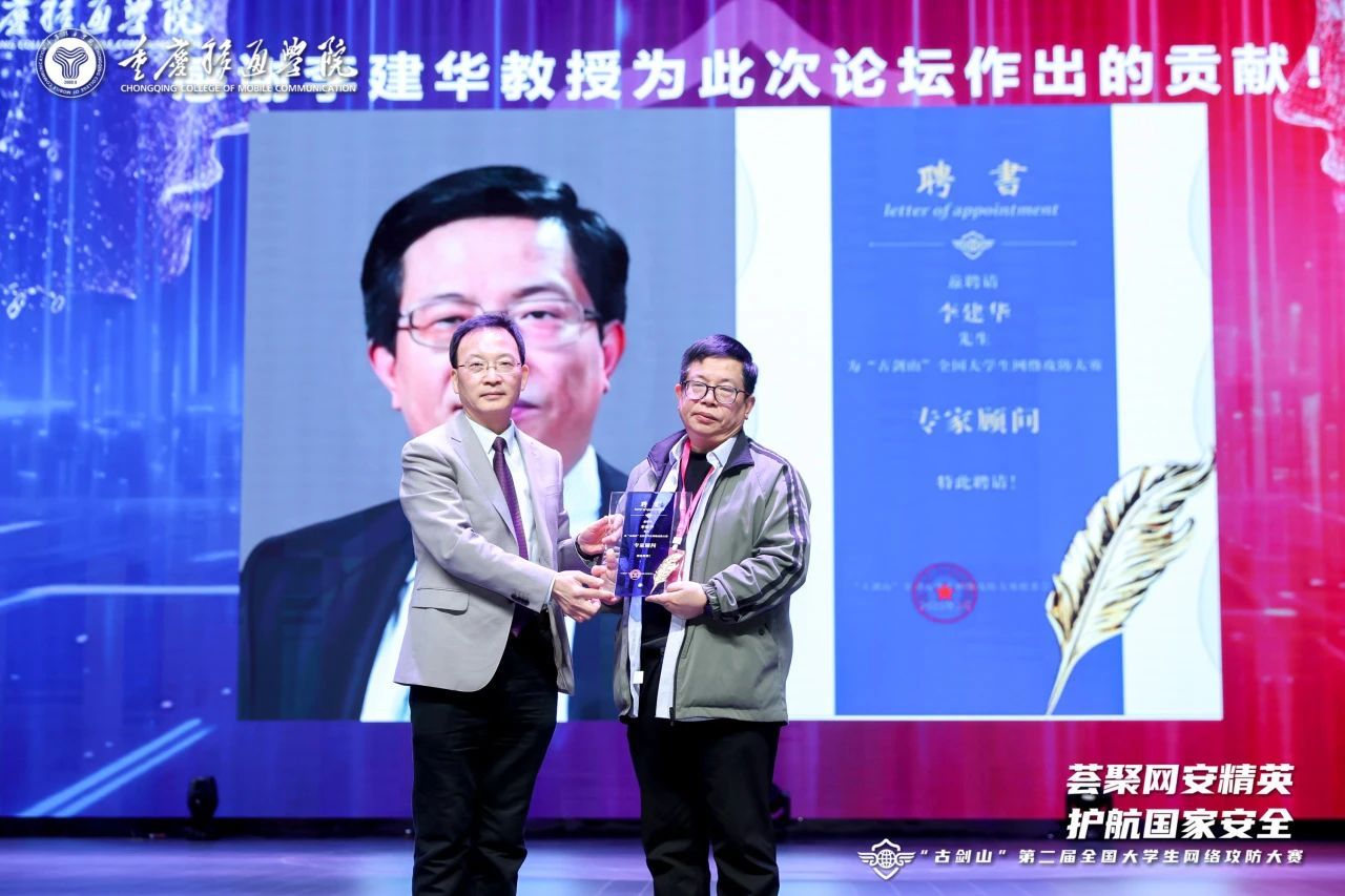 (重庆移通学院校长吕翊为李建华教授颁发“古剑山”全国大学生网络攻防大赛专家顾问聘书)