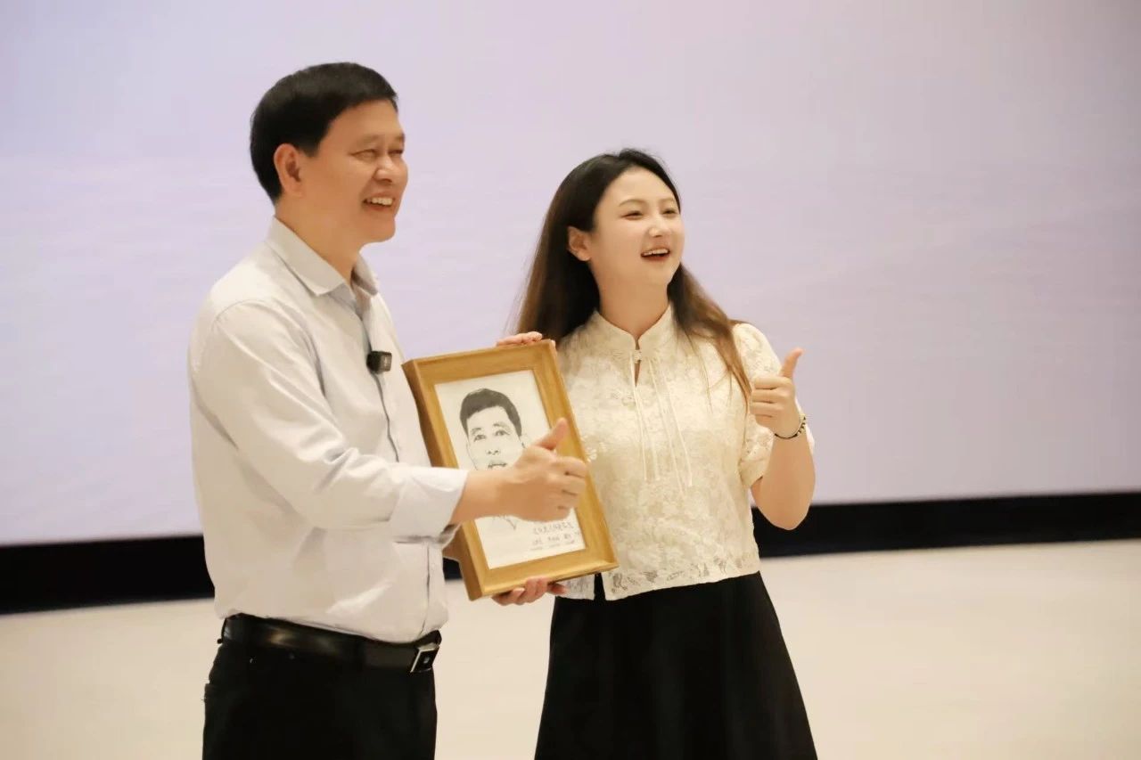 讲座现场,周昌新教授收到了一份特别的礼物——出自重庆移通学院非物质文化遗产馆学生自绘的市级非物质文化遗产綦江区农民版画,学生将周昌新教授的形象绘入带有浓郁本土韵味的版画中,承载着学生们对周昌新教授的尊敬和对非遗文化的热爱与传承之心。