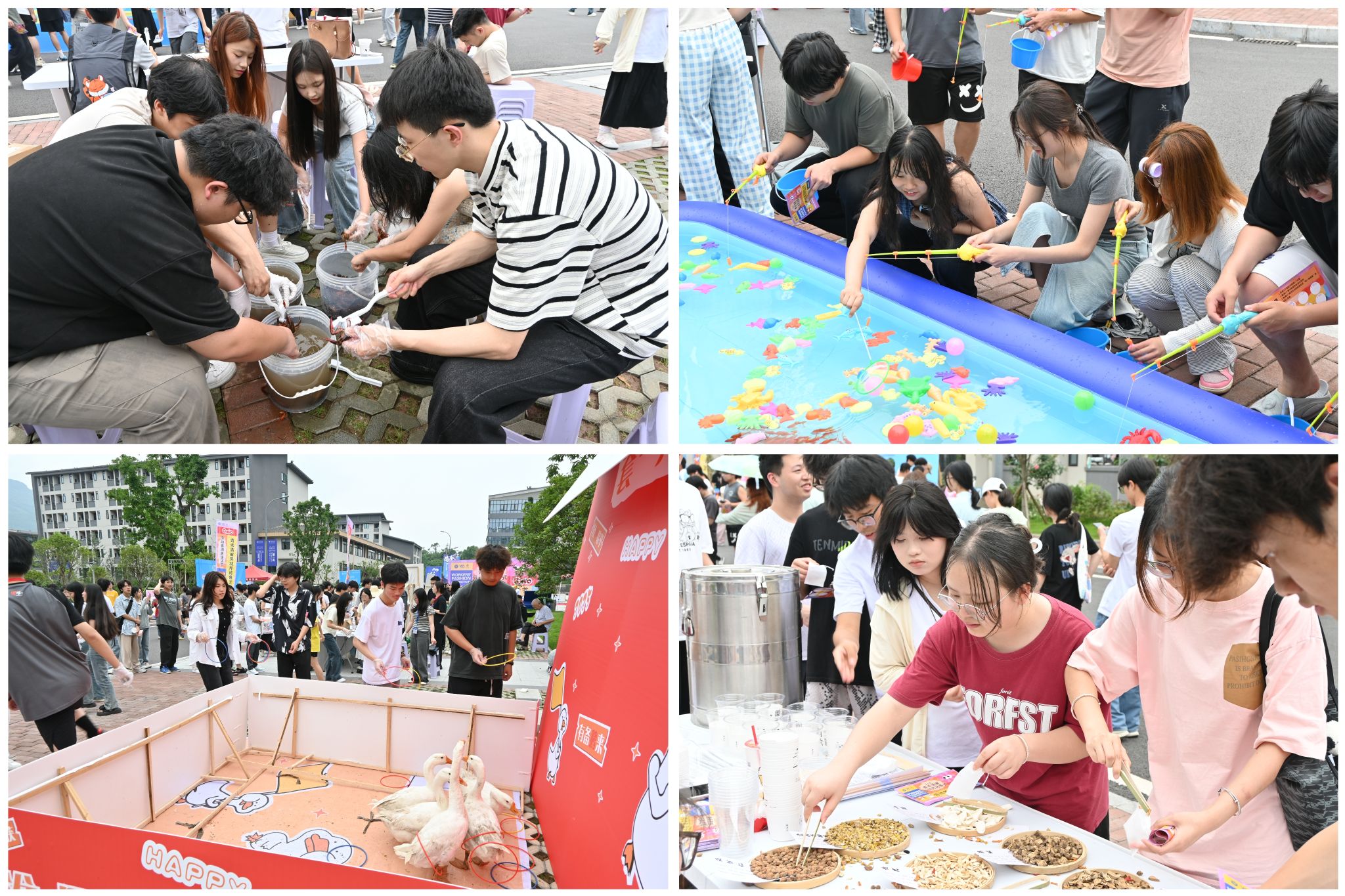 闭幕式通过三大板块展现劳动教育的多维价值,吸引3000余师生参与其中。在“耕织万象”成果展中,精工匠心坊的竹编花灯、农田实践的影像记录、农耕研学基地的创新规划,立体呈现了千余名师生在216亩生态农田中躬耕不辍的实践成果。“劳动者潮趣生活节”则通过十余项创意活动打破传统劳动的固有印象。从“锤爆烦恼”的情绪释放到“套圈大鹅”的趣味挑战,从“钓咸鱼”“刷龙虾”的农事体验,到“养生茶调配”的生活美学,活动将传统农耕文化与年轻态生活方式巧妙融合。正在参与活动的2024级刘强彬同学表示:“没想到劳动还能这么玩,脱离土地,也能感受到劳动的力量,在这里,劳动不再是单调的重复,而是充满创造力的自我表达。”